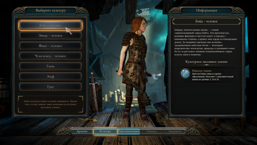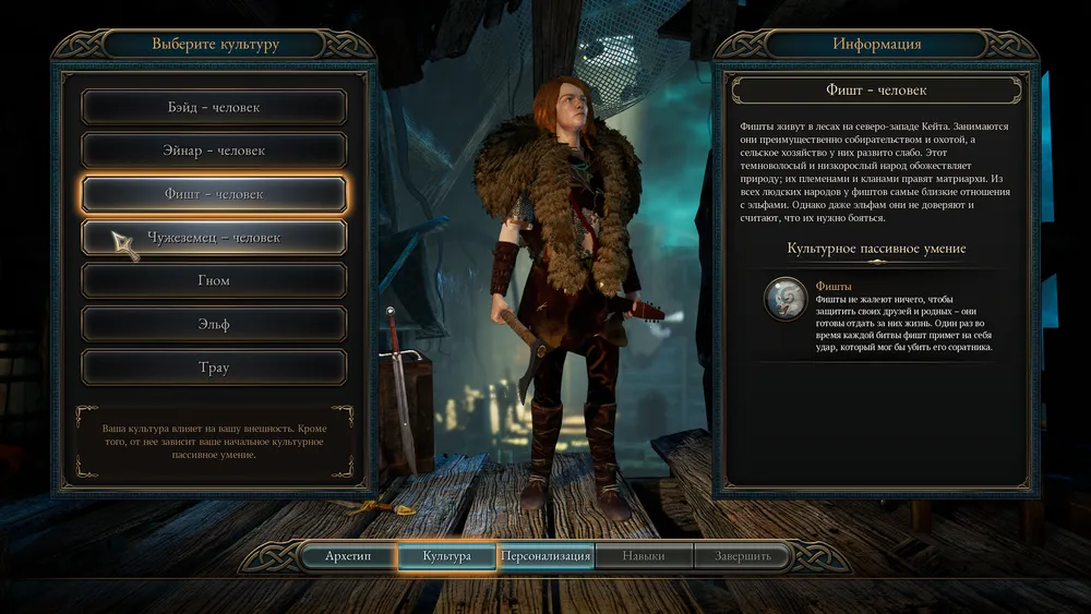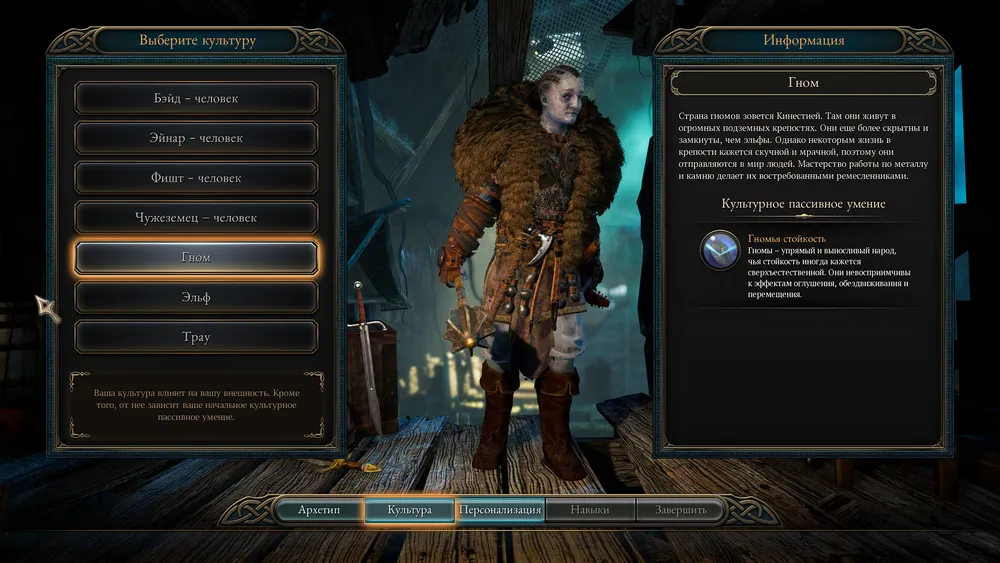 Помимо класса, можно выбрать культуру, к которой принадлежит наш герой. Каждая культура даёт персонажу пассивное умение. В игре представлены 4 человеческих культуры: Бэйд (+1 дополнительный навык на 3м, 10м и 18м уровнях), Эйнар (+1 к силе до конца боя за каждый полученный удар), Фишт (один раз за бой спасает союзника от гибели, принимая удар на себя), Чужеземец (иммунитет к яду, кровотечению, огню), а также представители других рас: гномы (невосприимчивость к оглушению, обездвиживанию и перемещению), эльфы (+30% к интеллекту и +1 к максимуму маны), трау (один раз за раунд, когда трау убивает врага, отряд получает очко действия).
