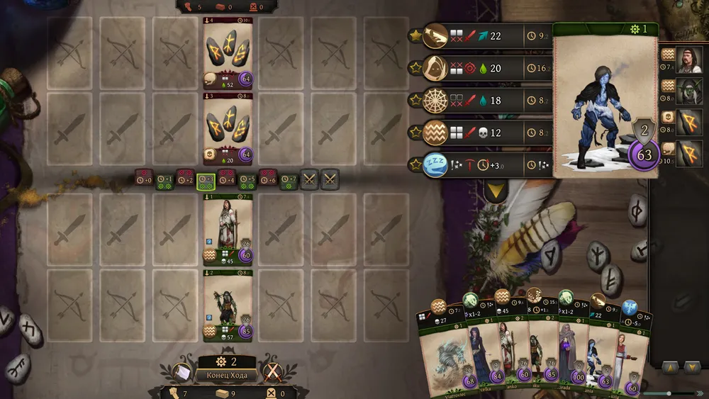 Субъективно показалось, что лучшее рукопашное оружие в игре – двуручный топор. Для полноценного использования АОЕ-урона от двуручника или молота надо чтобы «сошлись звёзды». Противник не дурак и будет стремиться к расстановке, максимально затрудняющей применение АОЕ. А высокая плотность врагов на доске (при нормальной сложности) скорее исключение, нежели правило. Топор же выдаёт стабильный высокий урон по одной цели и имеет довольно низкую задержку.