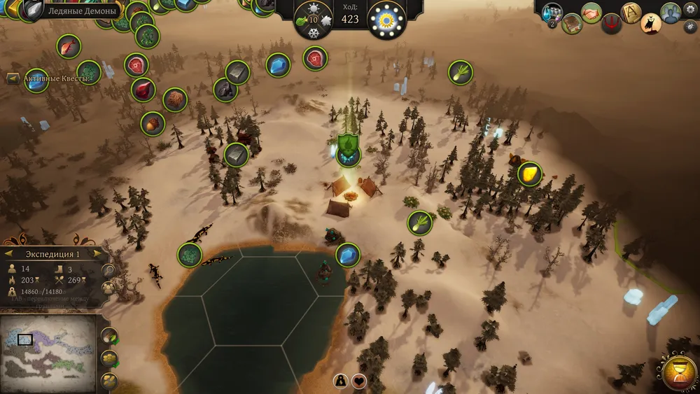 В конце любого хода отряда можно поставить временный лагерь, он позволяет заняться исследованиями, собрать близлежащие ресурсы, приготовить пищу. Кроме того, восстановление после боя в нём ускоряется. В целом, это такая деревня «лайт», не требующая никаких ресурсов и внимания. В конце хода поставил, в начале следующего снял, ну, или задержался подольше.