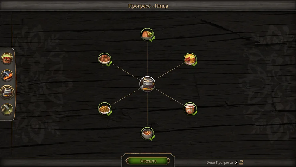 Кулинария похожа на алхимию. Самые простые рецепты известны сразу, более сложные надо изучать, но их структура намного проще, чем у ресурсов: есть всего 6 типов блюд, каждое из пары ингредиентов. Готовые блюда «сытнее» (дольше расходуются) в полтора раза сырых ингредиентов, чем шире ассортимент, тем выше мораль, а это бонусы к атаке и защите (поначалу довольно важны, потом – так, всего лишь приятный бонус).