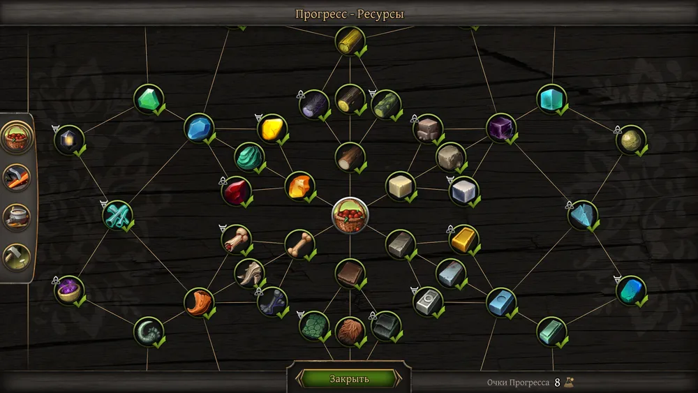 В игре есть 5 уровней ресурсов. Самые примитивные ресурсы - первого уровня известны сразу. Это песчаник, кость, дерево, кожа, железо и янтарь. Их можно сразу же и добывать. На втором уровне уже появляются более сложные ресурсы, например, сталь, эльфийское дерево, кровавая кость, гранит. Их уже надо изучить перед добычей.