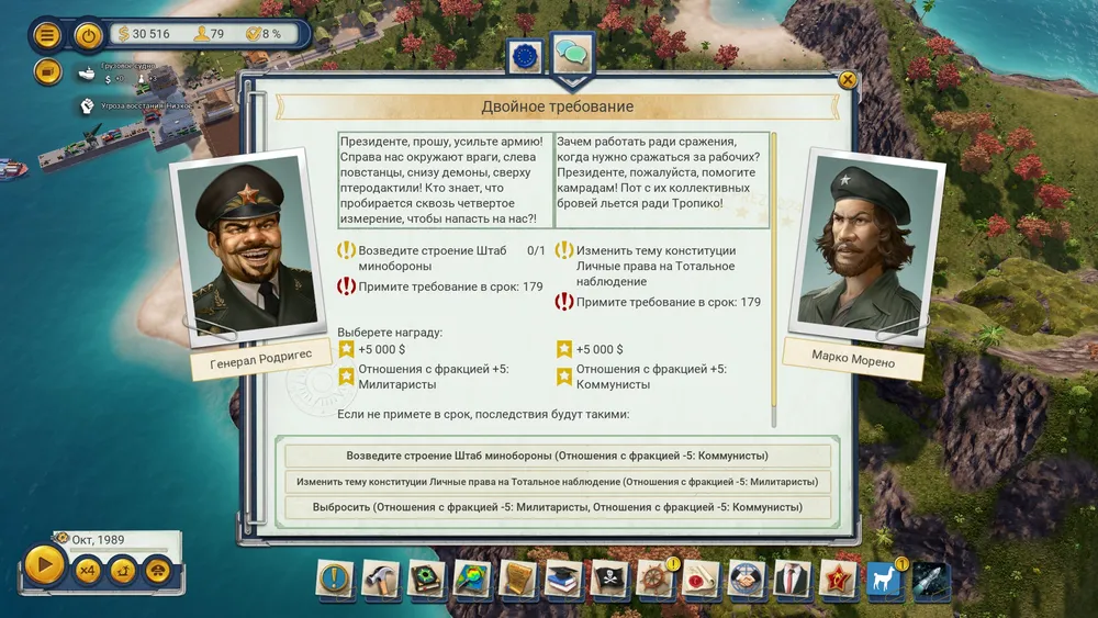 Чтобы не дошло до кровопролития и разрушений надо задабривать не только отдельных жителей, но и политические фракции. В вашей «банановой республике» будут и коммунисты, и монархисты, и милитаристы, и капиталисты, и много кто ещё. У каждой фракции, кстати, есть конкретный лидер, прислав которому чемодан с купюрами можно на время увеличить показатель одобрения у всей фракции, который в свою очередь увеличит одобрение и у тропиканцев в этой фракции состоящих.
