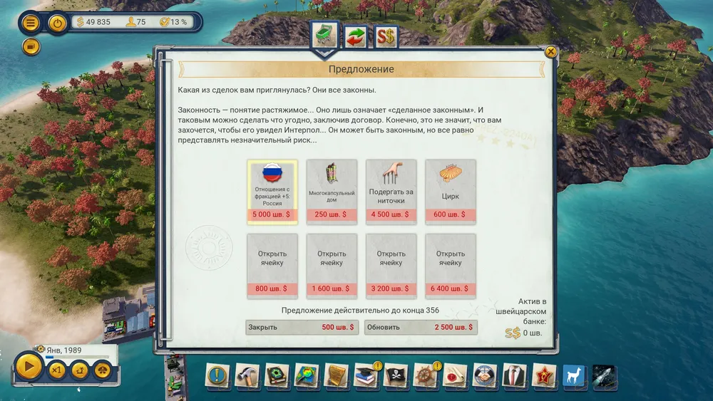 Наиболее крутые (и наименее легальные) приёмы доступны у некоего Брокера за ваши личные накопления в швейцарском банке. А пополнять этот швейцарский счёт вам тоже предстоит заключая сделки через Брокера.
