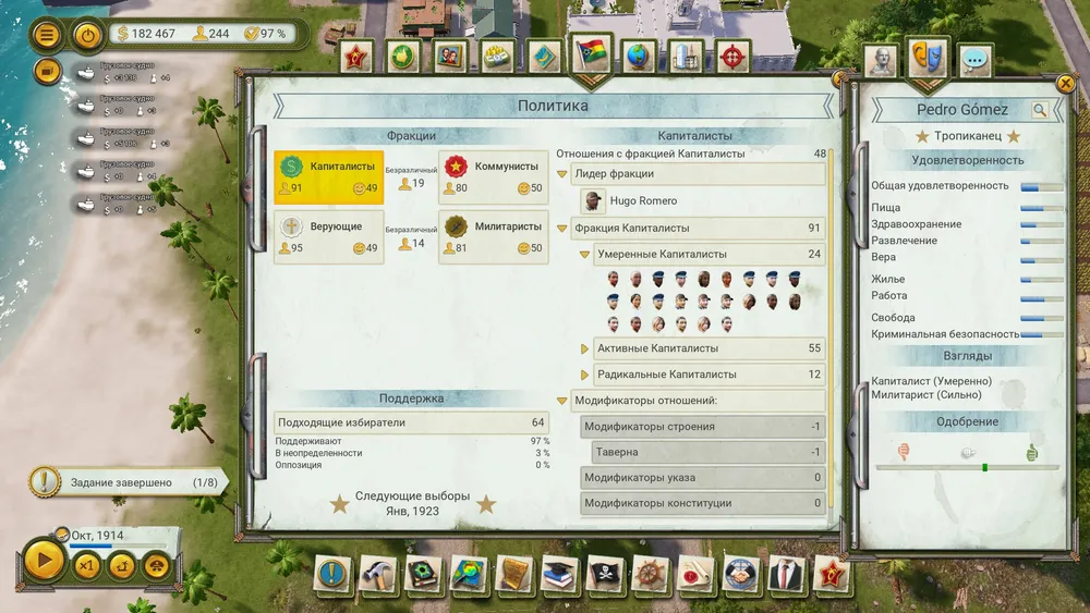 Впрочем, подкуп — скорее экстренная мера, притом весьма затратная. Гораздо выгоднее просто выполнять просьбы, с которыми та или иная фракция обращается к вам с завидной регулярностью. Это может быть принятие какого-то закона, производство или импорт определённого товара, постройка какого-то здания. Интересно, что задания эти довольно рандомны. Генерал-милитарист может попросить произвести партию рома, а лидер коммунистов, допустим, таверну. Впрочем, при постройке зданий вы можете получать перманентный бонус к отношениям. И тут уже всё соответствует наклонностям партии. Верующие радуются часовням, милитаристы — казармам и сторожевым башням.