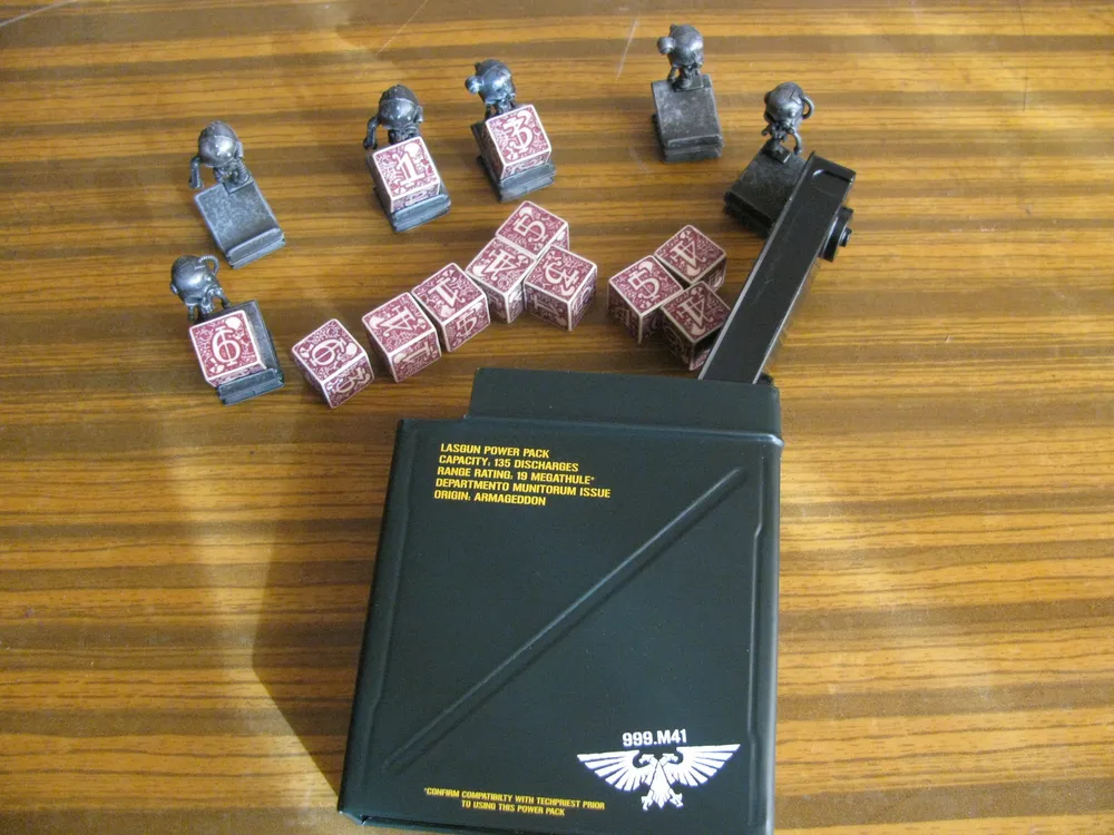 - 12 специальных кубиков в комплекте с футляром в виде батареи лазгана и 6 подставками для кубиков;