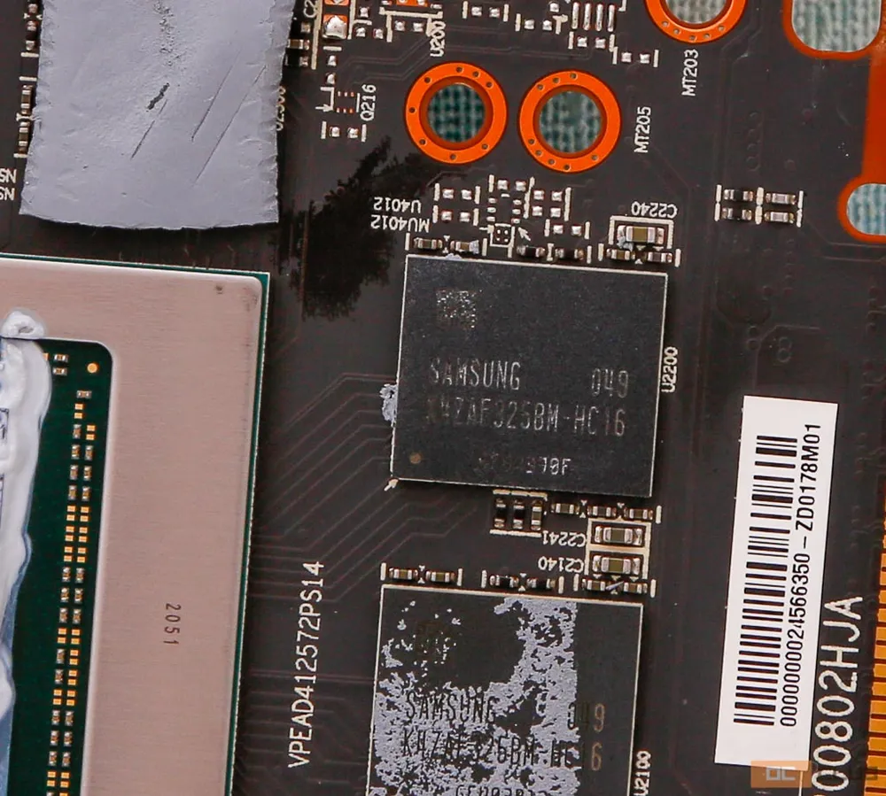 Распаяны 16 Гбайт видеопамяти типа GDDR6, набранные восемью чипами от Samsung (K4ZAF325BM-HC16) с эффективной рабочей частотой 16 ГГц.