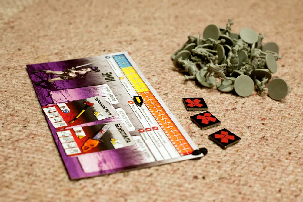 Но бесплатно вам выдают в лучшем случае пистолет или топор. Особо везучие начинают игру со сковородкой в руках. А вы пробовали забить зомби сковородой? То-то и оно. Поэтому выжившим предстоит тщательно обыскивать (но не больше раза в ход) помещения и машины. Можно отыскать оружие, припасы (квестовые предметы), компоненты для сборного оружия и всякие полезности. Каждый выживший может держать до пяти карточек, но только две из них в активе (по количеству рук). Так что из всего арсенала придется выбрать два оружия, и пользоваться только им. Если у вас лежит что-то интересное в резерве, то придется потратить очко действий на перевооружение.