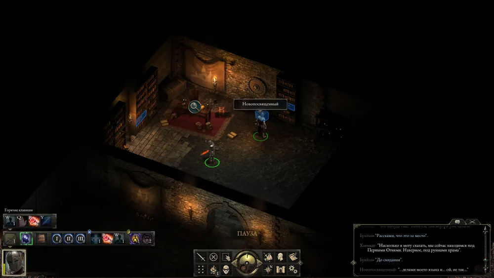 Проходим мимо наёмников к новопосвящённому, хитростью узнаём нужные для общения с аколитом слова.