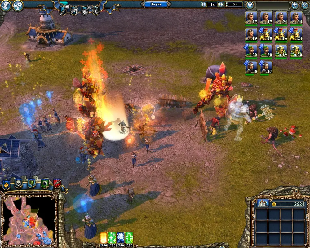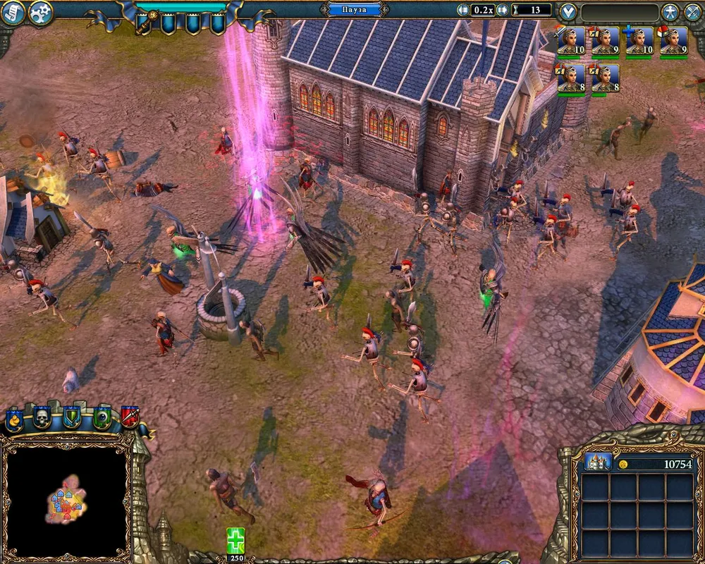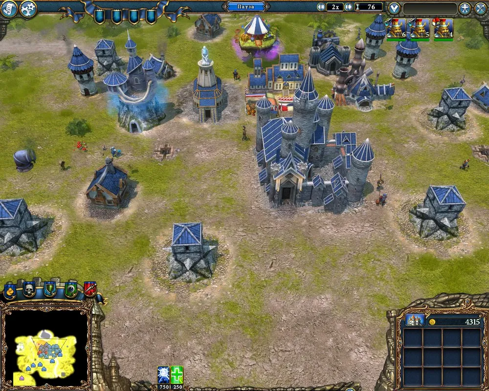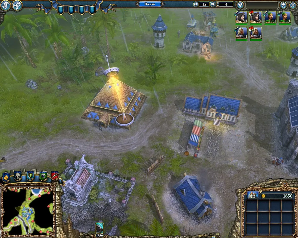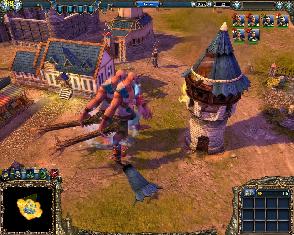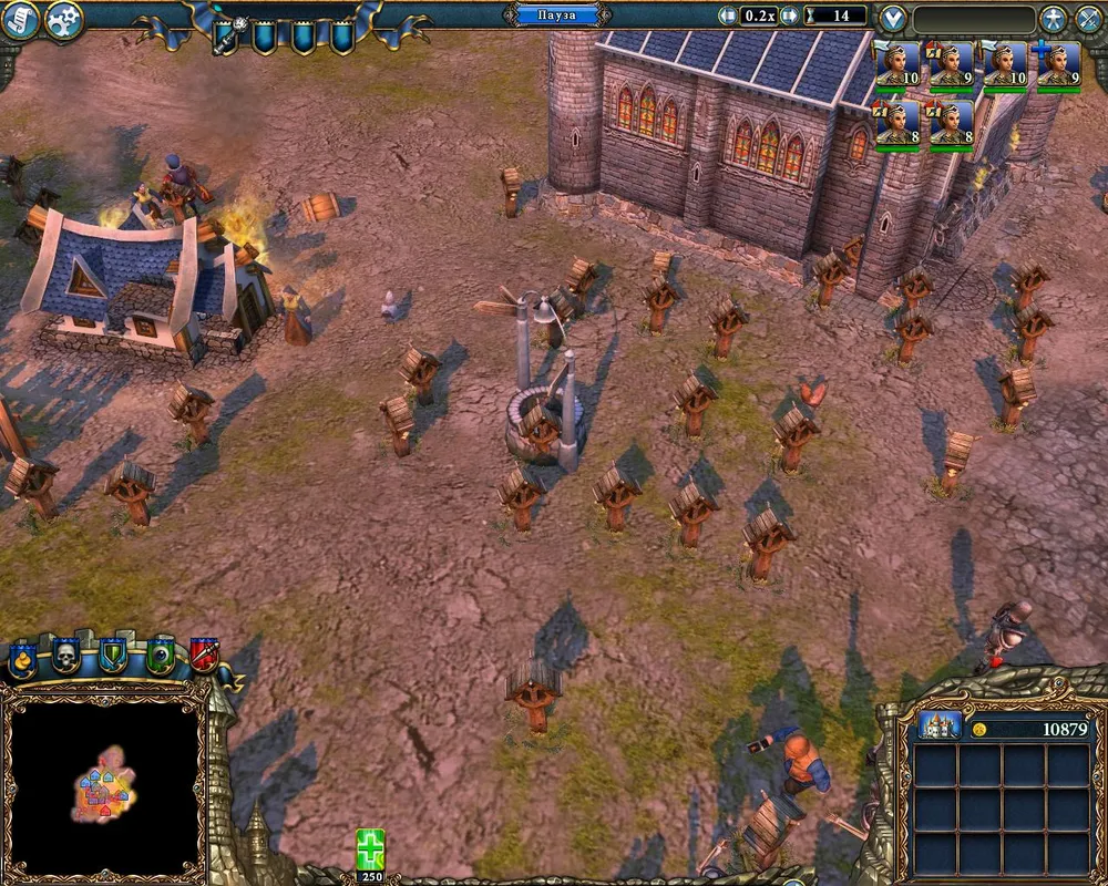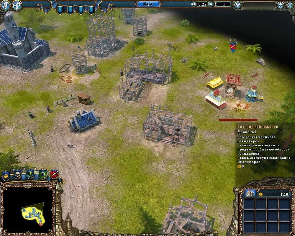 Неподалёку от дворца находится гнездо змей – возводим рядом с ним охранную башню. Как только будут разведаны окрестности, ставим флаги атаки на вражеские объекты; причём достаточно по 200-300 единиц золота. При первой возможности отстраиваем гильдию послушниц и гильдию магов. Последняя нам не нужна, но она позволит возвести магическую лавку – здание, приносящее прибыль. Через десять дней от начала миссии получим золото – настало время улучшать замок, кузницу и возводить поселение гномов.