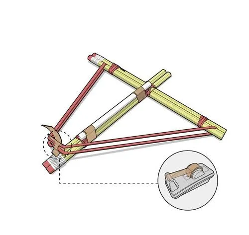 Вставляем между поперечных связанных карандашей на корпусе две резинки по краям, как показано на рисунке. ВАЖНО - эта резинки - одни из важнейших частей арбалета, именно они определяют мощность выстрела.