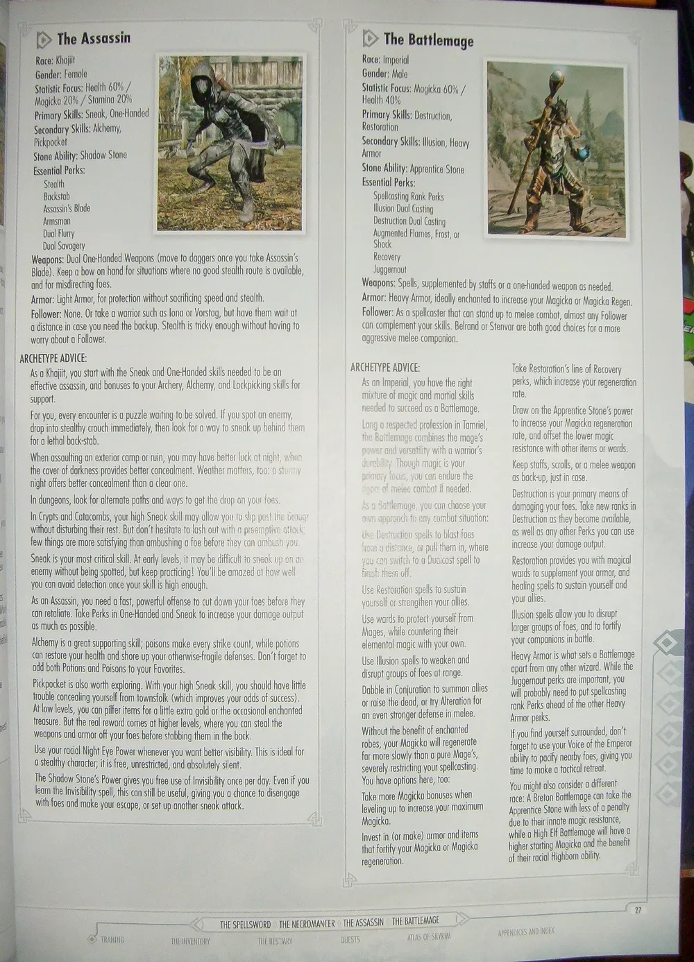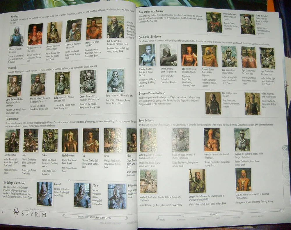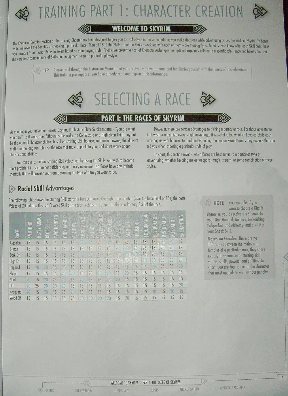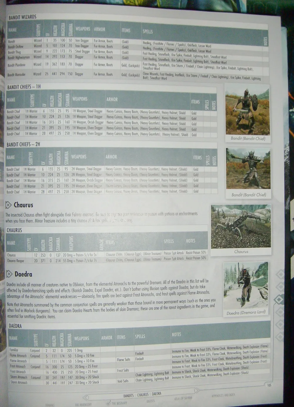 Содержит описание всех существ, которые встретятся в Скайриме. Таблицы включают уровни, параметры, броню, оружие, заклинания по каждому существу.