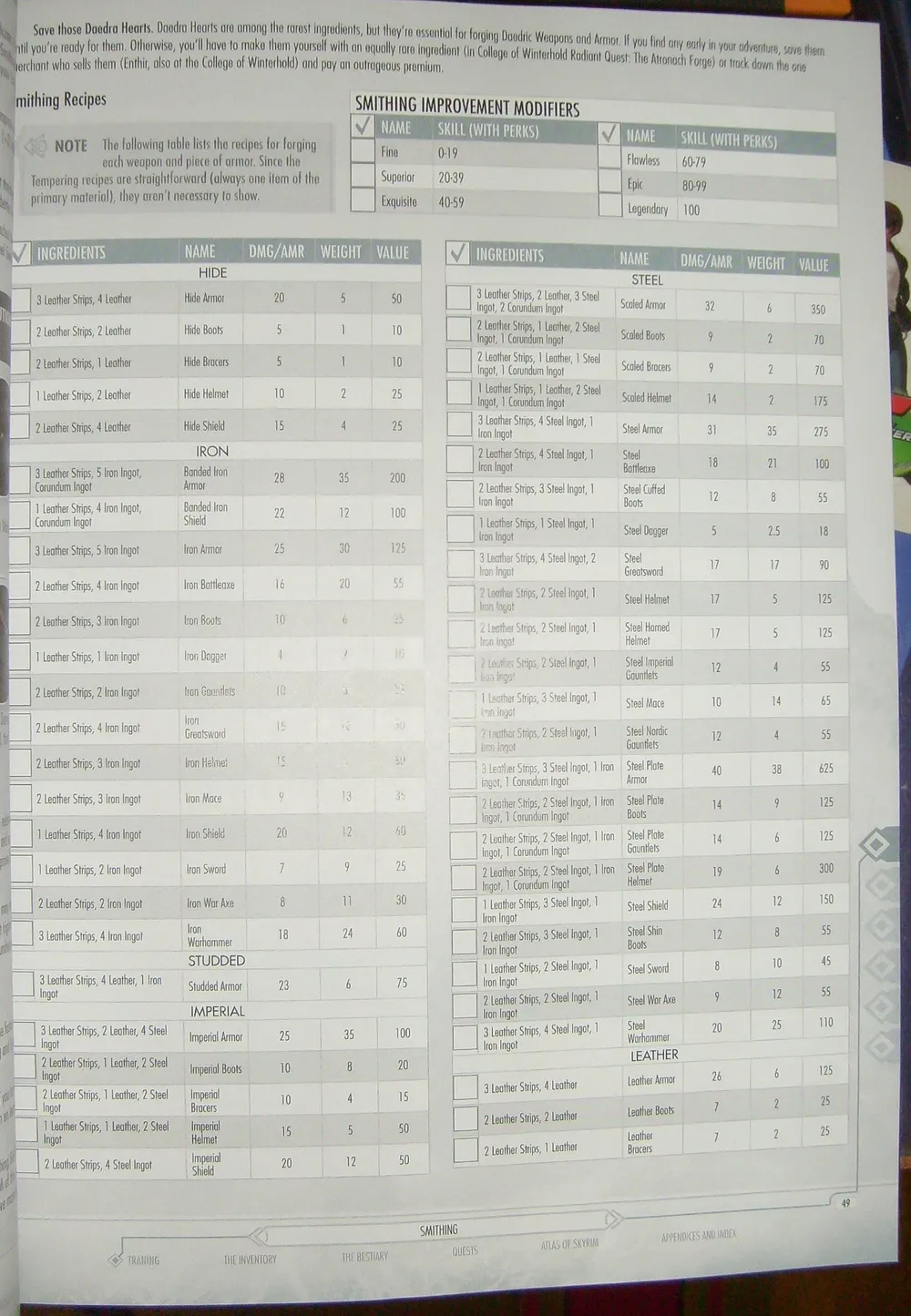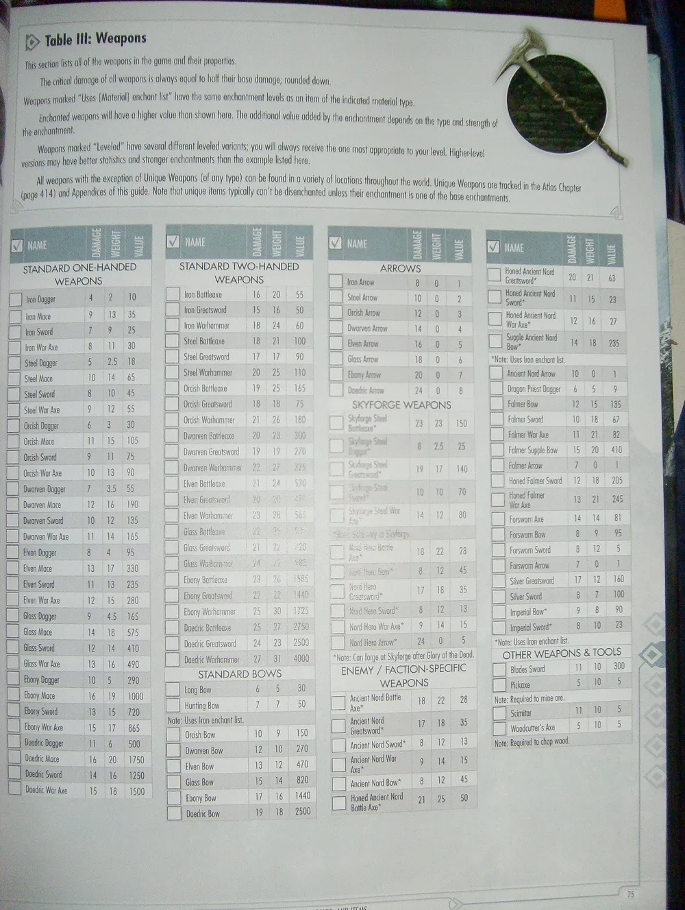 Включает таблицы оружия, брони, крафтовых вещей с их параметрами; книг с их местоположением.