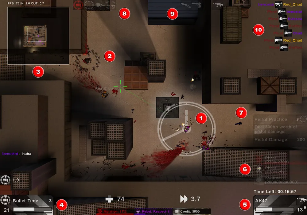 Ага! Ты зашел поиграть во второй раз и теперь пришло время драть задницы и передницы! Ты проклял Ученых-неудачников и на этот раз решил играть за Повстанцев. Ты уже не дурак, и понял как покупать новое оружие, вкурил как учить навыки, зарубил на носу как рулить на поле битвы. Смотри на скриншот выше - ты используешь навык "Bullet Time". Это активный навык, включив который ты заставляешь летящие на тебя пули сбавить ход.