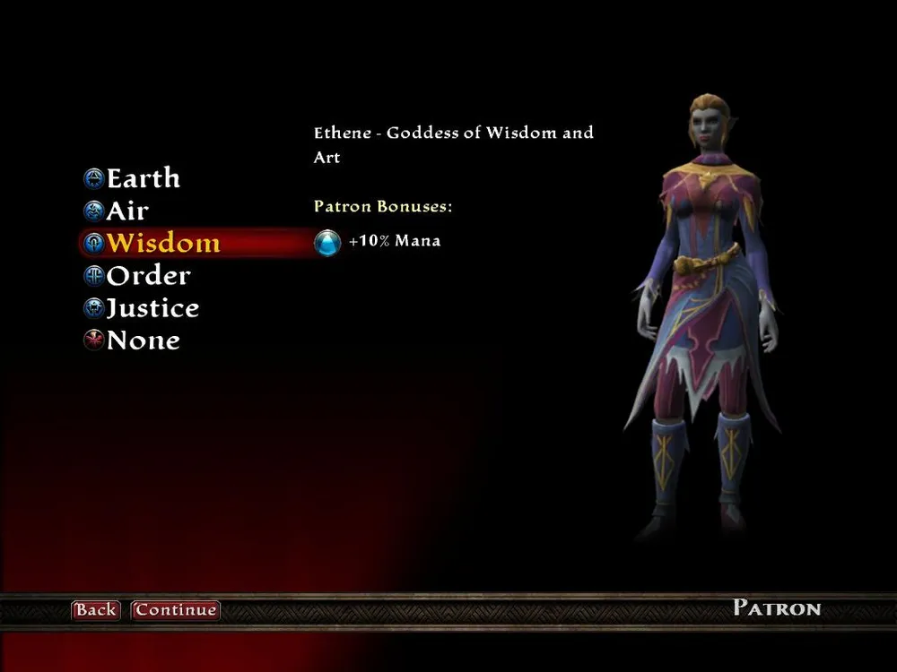 И тут меня ждало первое разочарование, всего 4 расы...какого лешего? Хорошо если бы эти расы были совсем не похожи друг на друга, но ведь первые 2 расы это люди, которые отличаются лишь названием и тоном кожи. Тоже самое и с двумя оставшимися эльфо-подобными расами. Возможно это две расы, только разные народы, но от этого веселее не становится. Скрепя зубами мы все таки выбираем одну из предложенных нам рас и переходим к экрану выбора божества. От выбора покровителя будут зависеть бонусы которые вы получаете, это небольшие прибавки к хп или мп и силе заклинаний.