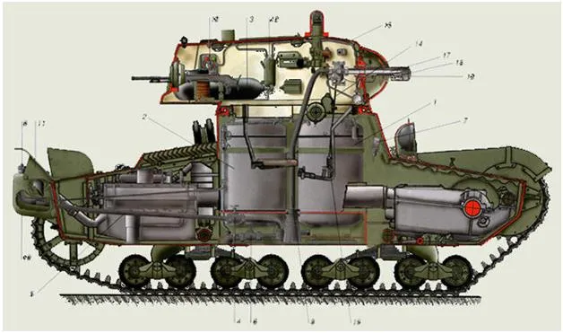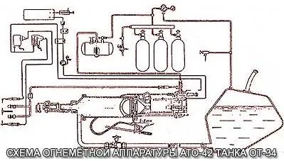 1 — резервуар передний; 2 — резервуар задний; 3 — баллон со сжатым воздухом; 4 — вентиль дымопуска; 5 — трубопровод; 6 — вентиль для слива жидкости; 7 — контрольный манометр; 8 — вращающийся трубопровод; 9 — насадка для дымопуска, распыления ОВ или дегазации; 10 — броневой кожух; 11 — щиток насадки; 12 — бензиновый бачек; 13 — башенный редуктор; 14 — электропровод; 15 — воздухопровод; 16 — ножной спуск; 17 — брандспойт; 18 — зажигалка; 19 — броневой кожух.