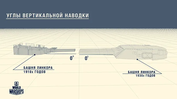 Если направление выстрела задаётся поворотом орудийных установок, то нужная дальность углом возвышения. Максимальный и минимальный углы напрямую зависят от конструкции орудийных установок. Эти параметры совершенствовались по мере развития кораблестроения и, конечно, будут ощутимы для игрока по мере прокачки самого корабля и его функциональных компонентов.