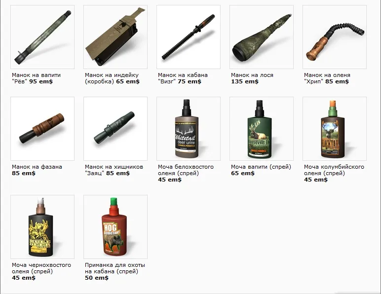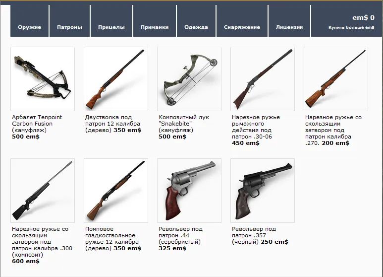 Так же есть игровой магазин, в котором мы можем купить все, что необходимо для охоты. Здесь представлены разнообразные виды оружия, начиная от гладкоствольных ружей и заканчивая луками и арбалетами. Но для удачной охоты, нам нужно не только оружие, но и приманки и снаряжение для отдыха ночью или во время ливня.
