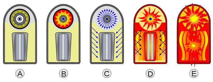 D Вторая ступень сжимается в следствии абляции (испарения) под воздействием рентгеновского излучения, и плутониевый стержень внутри второй ступени переходит в сверхкритическое состояние инициируя цепную реакцию, выделяя огромное количество тепла.
