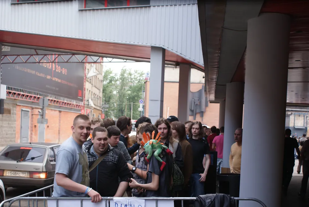 Когда мы с товарищем Kotovsky подошли к искомому входу, я сразу обратил внимание на длинную очередь страждущих фанатов. Некоторые из них, как мне сказали, пришли чуть ли не ранним утром, стремясь занять лучшие места в грядущем столпотворении. К слову сказать, ничего такого не наблюдалось до самого конца. Поклонники Diablo III вели себя очень организованно, стойко терпя внезапно нахлынувшую жару и духоту. Улыбки, смех, бурное обсуждение игры и здоровый ажиотаж – вот что могли наблюдать удивленные прохожие, недоуменно косившиеся на разношерстную людскую массу.