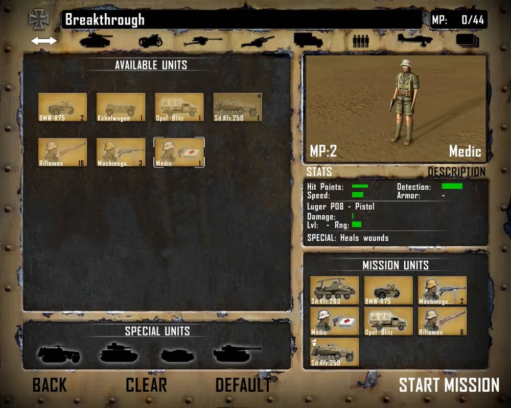 Парк техники приятно удивляет. И хотя самих боевых единиц чуть больше 20, набор подобран удачный. Есть и разного вида танки и самоходки, артиллерия и зенитные орудия, транспорт и разведка.