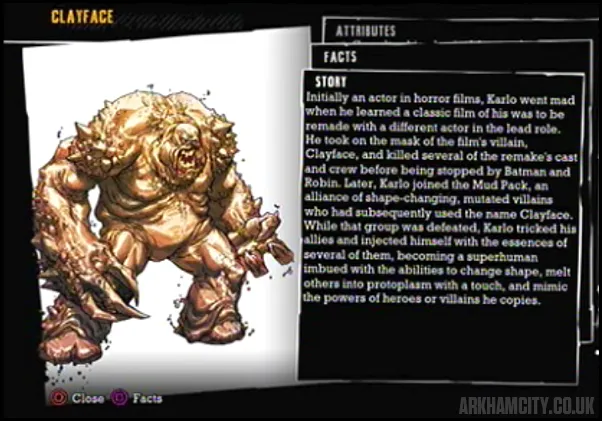 «Бывшая звезда фильмов ужасов, Карло обезумел, узнав, что его классический фильм будут переснимать с другим актёром в главной роли. Он принял облик злодея из фильма, Глиноликого, и убил нескольких членов съёмочной группы, работавших над ремейком, прежде чем его остановили Бэтмен и Робин» — биография Глиноликого.
