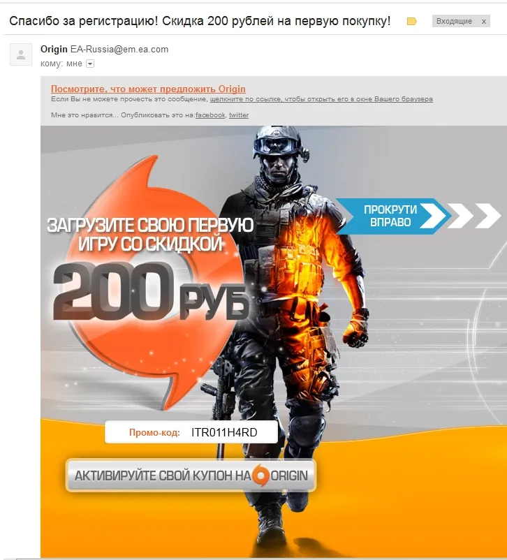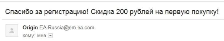 Мне тоже прислали, хотя имею в Ориджине 7 игр... Учитывай еще и тот факт, что чтобы использовать эти 200 руб., тебе нужно добавить в корзину игру дороже 400 руб... Эта скидка идеально подойдет тем, кто хочет купить DLC для BF3, которое выйдет в июне. Я сомневаюсь, что это DLC будет стоить 600 руб., но в любом случае 200 руб все же можно будет сэкономить.