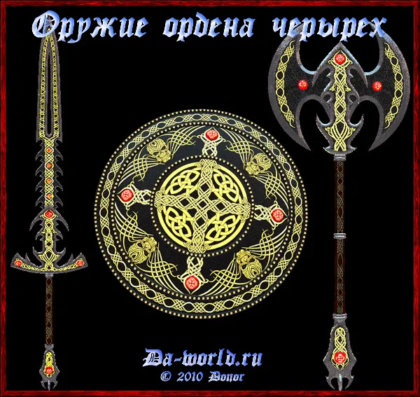 Оружие Ордена Четырёх…немногие в наши дни обладают знанием об оружии с таким богатым прошлым. Это и не удивительно. Могут ли смертные пронести сквозь века всё то великое, что совершается?! Нет, это невозможно. Историки и религиозные фанатики утверждают, что человечество познало божественное начало в лице богов, древнее которых может быть разве что сам Создатель, но в действительности существовали силы намного более таинственные и непостижимые. Это силы самой природы, некогда властвовавшие в мире, заставлявшие Древних Богов держаться как можно дальше от легковерных людей. Да что там Древние Боги, даже Создатель не смел оспаривать могущество четырёх великих властителей всего сущего! Обитатели земного мира называли их Орденом Четырёх. Они были истинными хозяевами Тедаса. Все, от рабов до королей молили Орден о милосердии и благословении, никто из живущих в те времена не допускал и мысли о неповиновении воли богов. Мир, ныне известный нам, создал именно Орден Четырёх – истинная власть всех измерений, а вовсе не Создатель. Да, такие слова могут показаться еретическими, но время правления Создателя наступило намного позже…