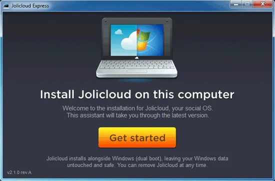 Не менее удобным является другой способ установки "облачной" системы, подразумевающий практическое использование программы Jolicloud Windows Installer размером 16 Мб (аналог Wubi в Ubuntu), скачивающей необходимые файлы из интернета и выполняющей развертывание Linux-платформы непосредственно из Windows. Никаких изменений в дисковые разделы при этом не вносится: создается только дополнительная директория, да корректируется загрузочное меню выбора ОС, в которое добавляется новый пункт Jolicloud. При этом установленную систему можно удалить в любой момент как обычную программу через панель управления Windows. Данный способ инсталляции разработчики рекомендуют начинающим пользователям.