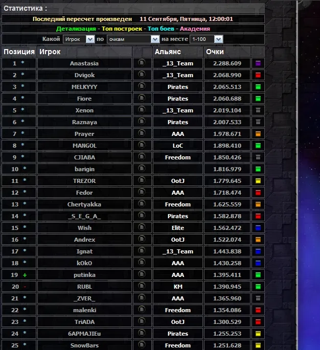- Появился статус пират. Пират, игрок, который нападает на слабых игроков (очков меньше чем у пирата в 5 раз). За такие нападения статус нападающего ухудшается, когда он становится черным, ему нельзя нападать на слабых игроков и ему запрещена торговля с другими игроками.