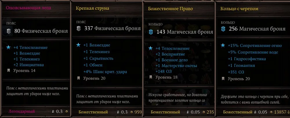 Чем выше уровень предмета, тем хуже становятся его дополнительные свойства: вместо значительной прибавки к характеристикам с повышением уровня добавляется по одной единичке, зато появляются смешные проценты к чему-либо или ничтожные добавления к очкам здоровья (при том, что враги легко «сносят» его тысячами).