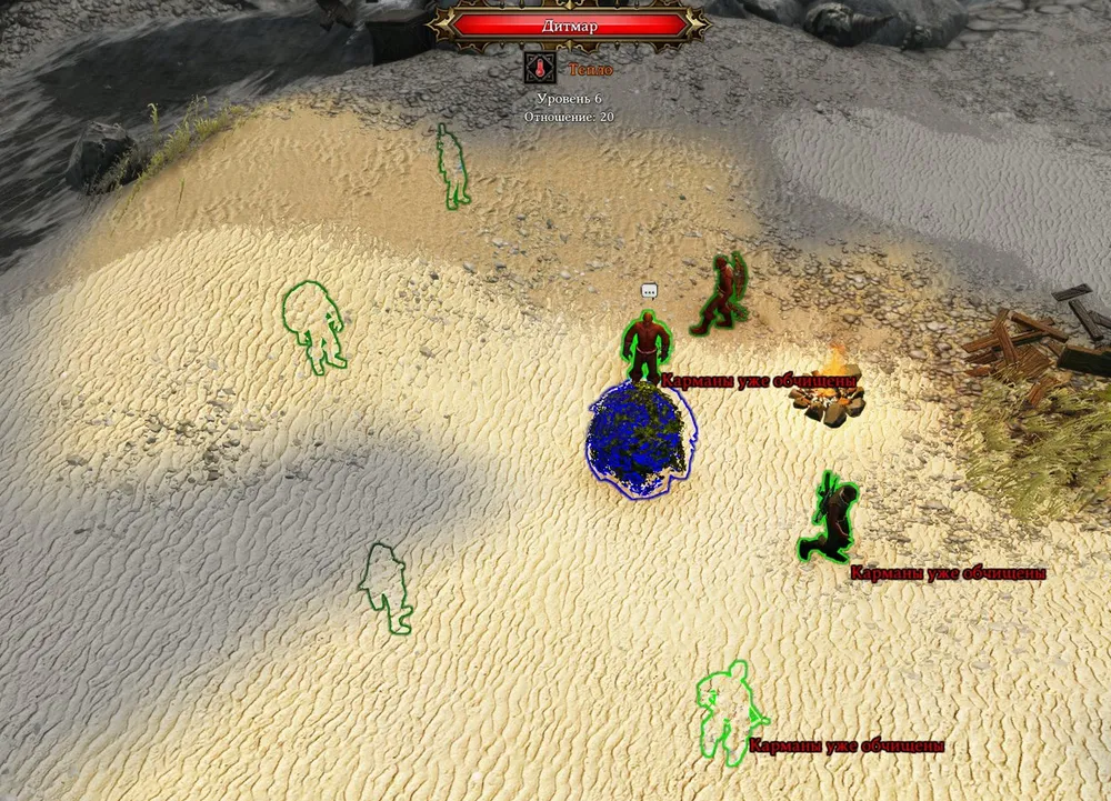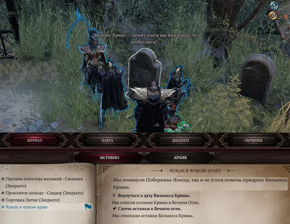 И ещё раз о линейности прохождения: нашёл могилу ящера, выкопал фрагмент тела, но забыл призвать дух. Сжёг фрагмент, вернулся к могиле: дух не призывается, квест не выполнен, опыт потерян. Что называется, без комментариев.