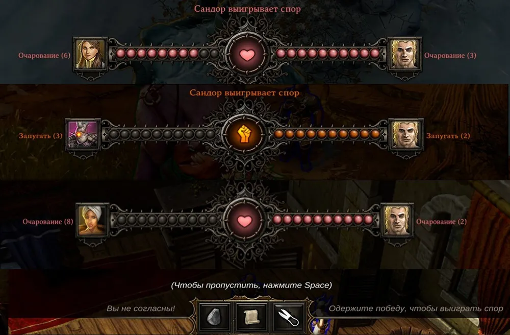 Реализация «Убеждения» первой части, на мой взгляд, на порядок интереснее второй: при должном упорстве геймера его герой почти всегда мог выиграть даже самый безнадёжный спор.