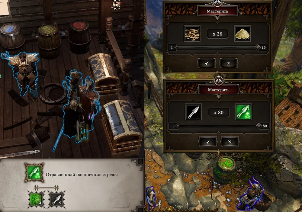 В первой части подходим к бочке, и все наконечники стрел становятся отравленными из одной. Во второй – либо при подходе к бочке отравлять наконечники по одному, либо при помощи рецепта все сразу – если бочка в рюкзаке. В случае, если используется рецепт, а бочки лежат в сундуке на «Госпоже Мести» – на каждый наконечник расходуется целая бочка яда (самое интересное, что этот абсолютно дикий баг так и не был исправлен: а зачем? Он же не приносит пользу геймеру, верно?).