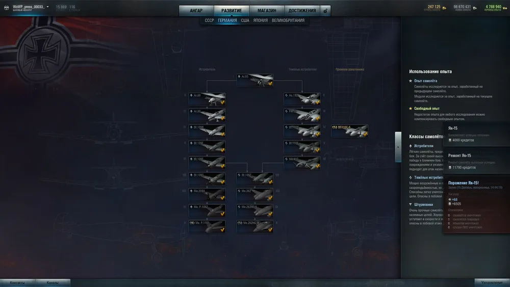 На данный момент в игре представлены следующие нации: СССР, Германия, США, Япония и Британия. Как и в World of Tanks, боевые машины разных стран располагают специфическими особенностями. Японцы, к примеру, обладают самыми маневренными истребителями в игре, немцы делают ставку на скорость и мощное вооружение, а советские “ястребы” рвут всех на ближних дистанциях как тузик грелку. Пока что порадовать изобилием техники могут лишь СССР и Германия, а хуже всего дела обстоят у Японии – кроме ветки легких истребителей у них ничего больше и нет. Прокачка машин осуществляется по схожему с WoT принципу: мы участвуем в сражениях, зарабатываем очки опыта и деньги, изучаем и покупаем новые модули, далее открываем самолет более высокого уровня, и таким вот образом действуем до самого конца, пока не добираемся до самой мощной “птички” в выбранной ветке – какой-нибудь реактивной бестии. Все вышеописанные манипуляции, а также установка оборудования, приобретение расходников, обучение пилотов и прочие немаловажные действия проводятся в ангаре, который, к слову, ничем не отличается от того, что мы привыкли видеть в World of Tanks.
