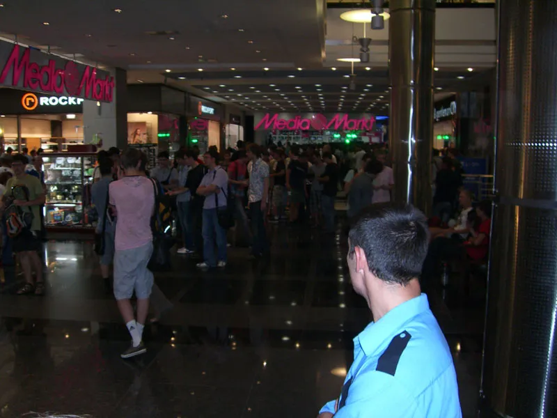 Не, когда мы приехали и начали взбираться на второй этаж, было еще ничего. А вот на втором этаже, невидимая, как рояль в кустах, нас ждала она - Подстава. Все подступы к Медиа Маркту были любовно перегорожены доблестными охранниками, которые мирно охреневали от наплыва народа. Может, я, конечно, чукча, но в чем смысл мероприятий, проводимых с 20.00 по 22.00, если вы даже не можете на них попасть? Да, можно, конечно, ответить извечным "А надо было раньше приходить!", но, на мой взгляд, это не тот случай. У всех людей со временем по-разному, и если эвент идет, скажем, от таких и до таких, на него должна быть возможность попасть всем, а не только тем, кто пришел в шесть утра с палаткой и портативным кострищем (кстати, хорошая идея! На эвент Диаблы 3 так и выдвинусь!).