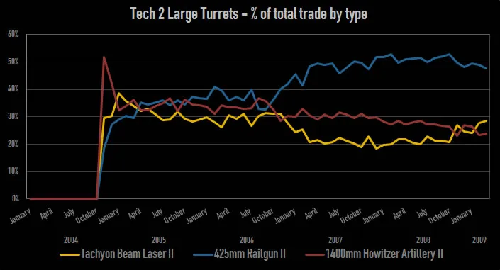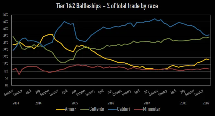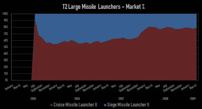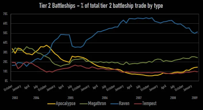Среди Т2 линкоров оставался довольно стабильным с начала 2006 года Raven (Golem) наиболее популярный броненосец. В прошлом году был достигнут значительный рост популярности Апокалипсис после его усиления в Trinity патче 1.1, а также наблюдается медленный спад в популярности Ravena с конца 2007.