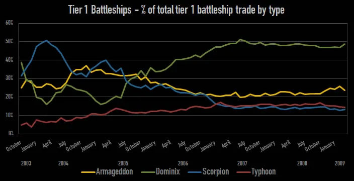 Популярность каждого из судов, оставалась стабильной с начала 2007 года пока Dominix не стал наиболее популярными линкором. На Dominix приходилось 48,26% линкоров на рынке с апреля 2007 по март 2009 года период. Мы можем предположить, что Dominix является самым популярным линкором благодаря своей универсальности, причем его эффективность в обеих PVE и ПВП средах в связи с его главным оружием - дронами, в результате чего хайслоты забиты для услуг людям (ремрепками обычно).