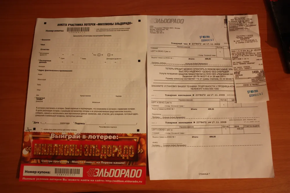 16 ноября, за день, было объявлено об условиях премьеры. Возможно, ты скажешь, что это слишком поздно, но в данном случае они были правы – первые 10 покупателей получали полную коллекционку первой Left 4 Dead! Если бы об этом узнало много народу, на входе в магазин была бы кровавая драка в момент открытия. А так все прошло мирно. Я лично этого не застал, но промоутер сказал, что народу в момент открытия было ровно столько, чтобы коллекционок хватило на всех. Поскольку у меня данная коробочка есть, я не спеша приехал в магазин к 12. Точнее, на Братиславской я был в 11, после чего долго искал в этом нагромождении дворов Эльдорадо. Нашел. Там мне сказали, что про L4D2ничего не знают, и что я ошибся адресом. Затем выяснилось, что в районе есть еще одно Эльдорадо! В общем, в 11.46 игра была куплена. Так точно время могу сказать потому, что на кассе мне дали кучу макулатуры – огромный чек и купон для участия в какой-то акции.