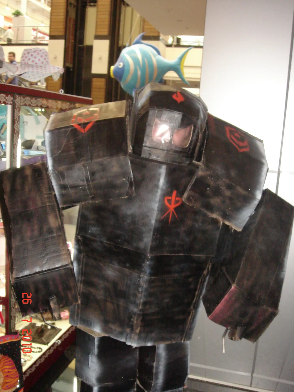 Примечание: Картон можно брать в простом магазине, спросите у продавцов, они обычно их выкидывают. Надо ещё подумать о транспортировке. Наш костюм был прочен, но такой большой, что во что-то положить было нереально, в этот день благо не было дождя, повезло, ещё мы положили ноги внутрь торса и привязали там, а к спине сделали ремешки, как рюкзак. Получилось удобно нести 5 кг картона. Везли в метро! Нас пыталась остановить(костюм выглядел очень устрашающе) группа милиционеров, мы смело испугались и прыгнули в вагон. Костюм делали первый раз, но не смотря на это получилось сносно. Делали два дня по 10 часов ДВА ЧЕЛОВЕКА- Nett и iZnatOk.
