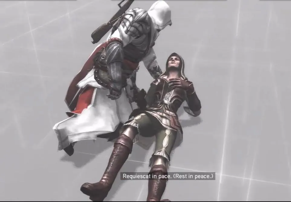 Лео, думая, что делать, ослабил хватку. Коварная женщина мгновенно этим воспользовалась и дернула ножом в сторону лица Лео, но нож рассек лишь воздух. Увернувшись, ассасин воткнул нож ей в горло.