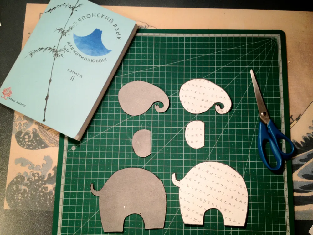 Далее нужно было найти жертву бумагу для слона. Будучи востоковедом, я решила, что тескт должен быть иероглифическим. "Спонсором" этого мероприятия стал второй том учебника "Японский язык для начинающих" Института Стран Азии и Африки (Москва). Надеюсь они не сильно обиделись. Как говорится, мне уже поздно заниматься по учебнику такого уровня.