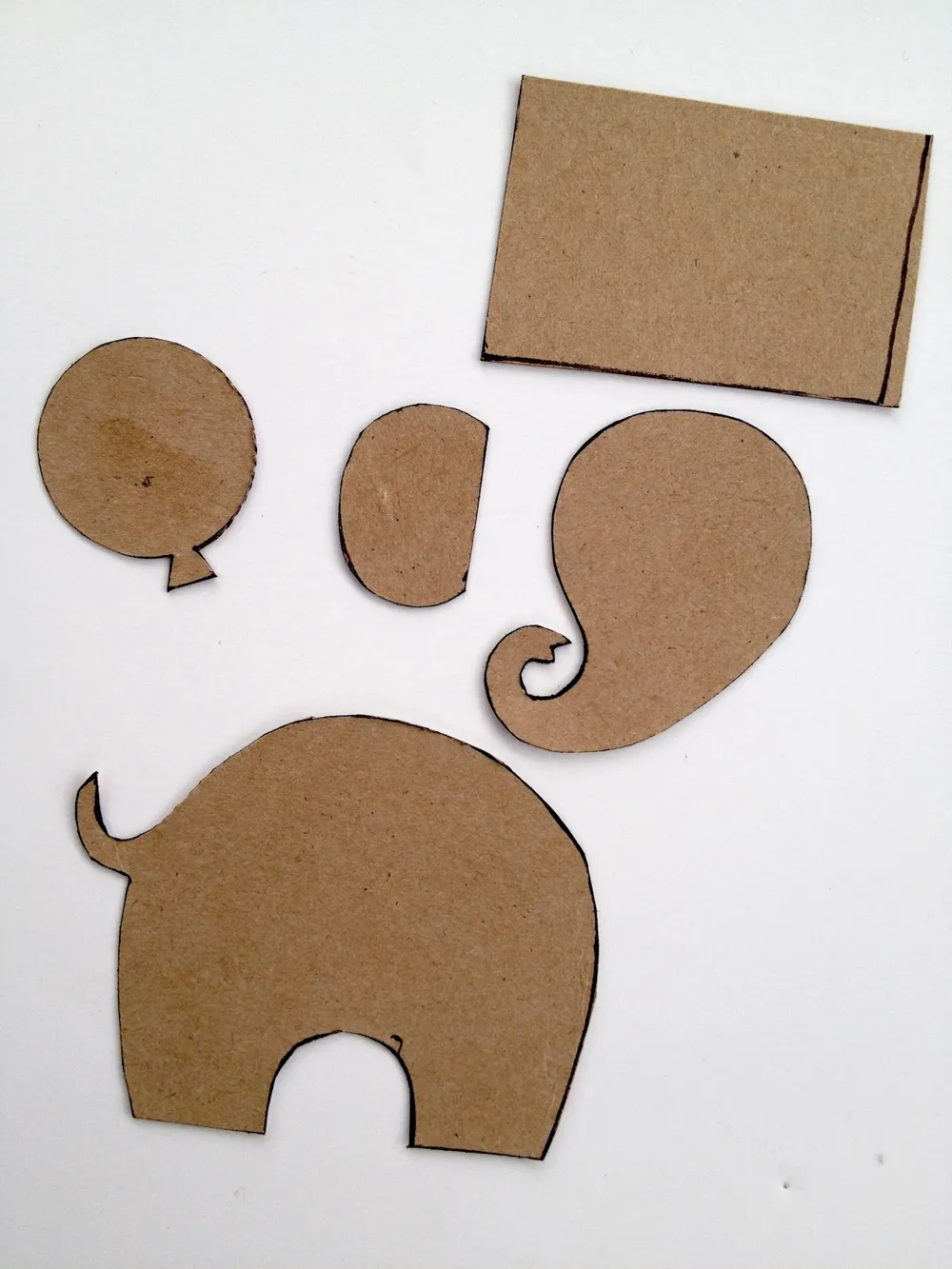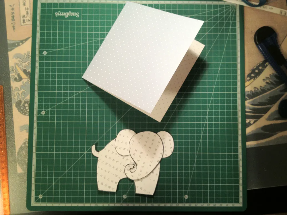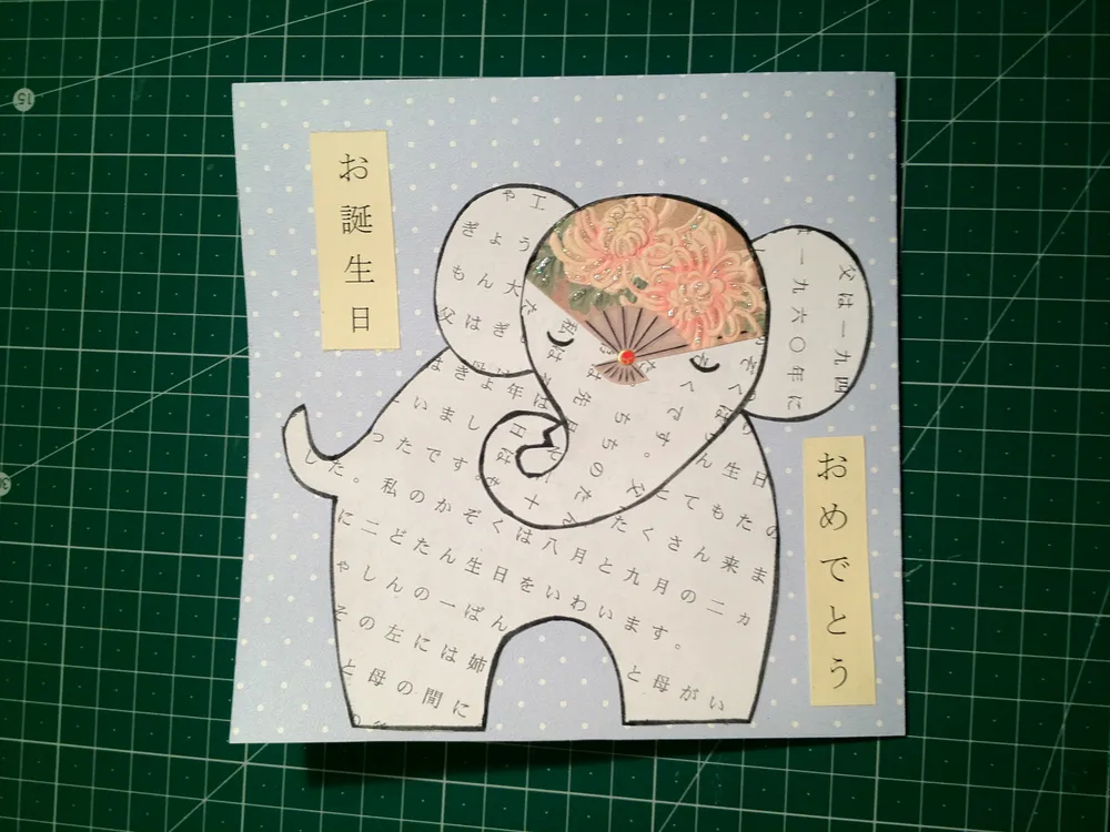 Далее слоненок обзавелся глазами, головным украшением, которое я вырезала из наклейки-веера, и поздравлением.
