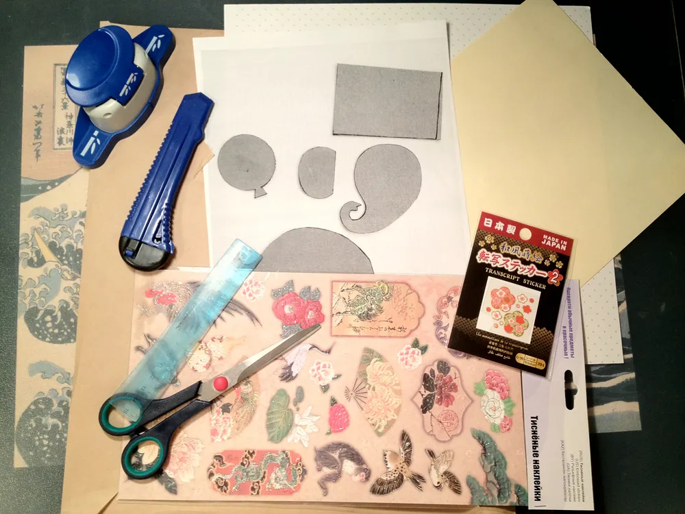 Концепция моей открытки была следующей: Восточная культура и природа. Пригодились японские наклейки с сакурой, которые мне вручили за четвертое место в соревнованиях по "говорению на японском". Также в магазине я купила наклейки с японскими мотивами.
