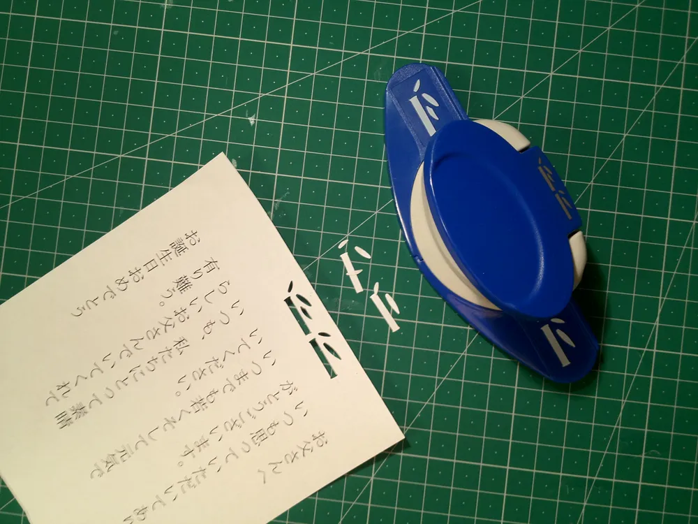 Теперь надо было оформить текст поздравления. Для этого я использовала агрегат, фигурный дырокол, который может вырезать стебель бамбука