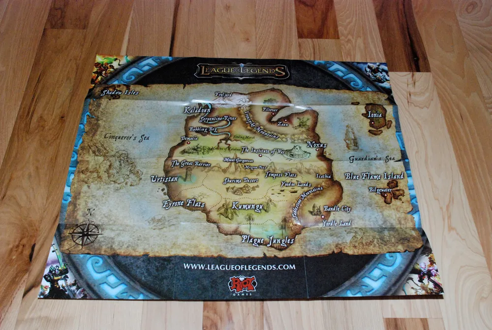 На снимке, как нетрудно догадаться закрытая коробочка с игрой. В правом нижнем углу - значок «Best of E3 winner» (победитель в номинации лучших игр на выставке E3). Руны вокруг названия игры сделаны в глянце и рельефны — очень прикольно сияют на свету и придают обложке красивую фактурность. Слева снизу логотип Riot около рейтинга ESRB. Игру заклеймили рейтингом Teen (от 13 лет).