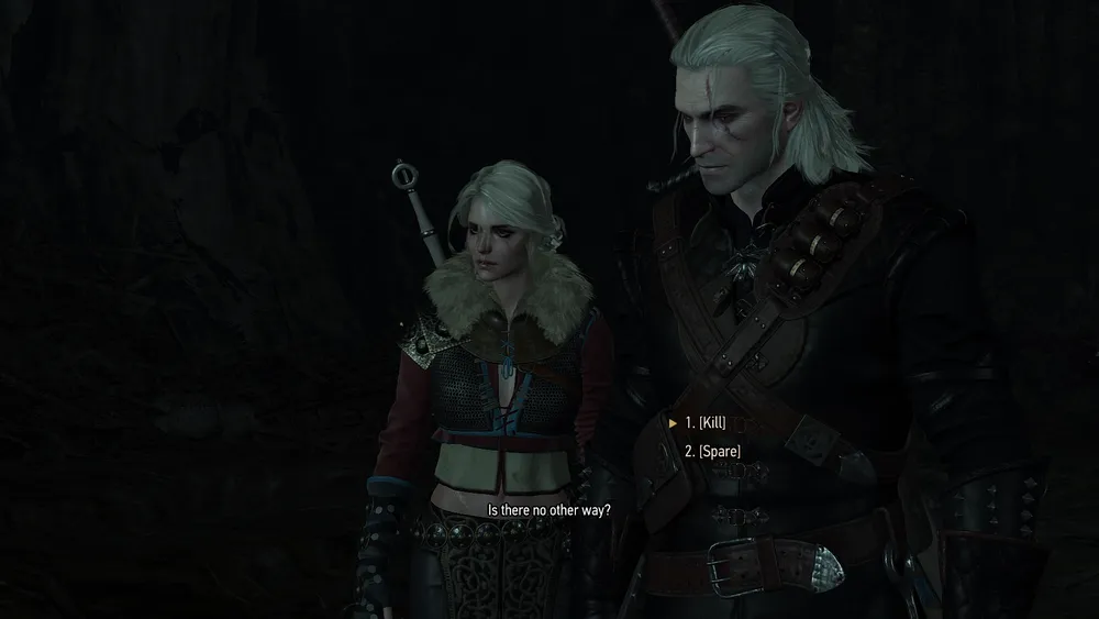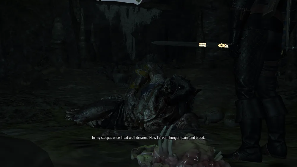 Щадим серого. Геральт берёт с него клятву человечины больше не употреблять и волколак покидает пещеру.