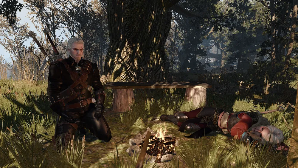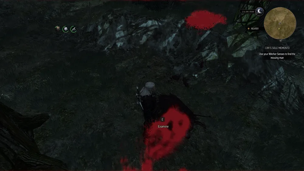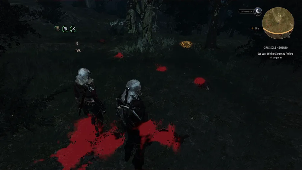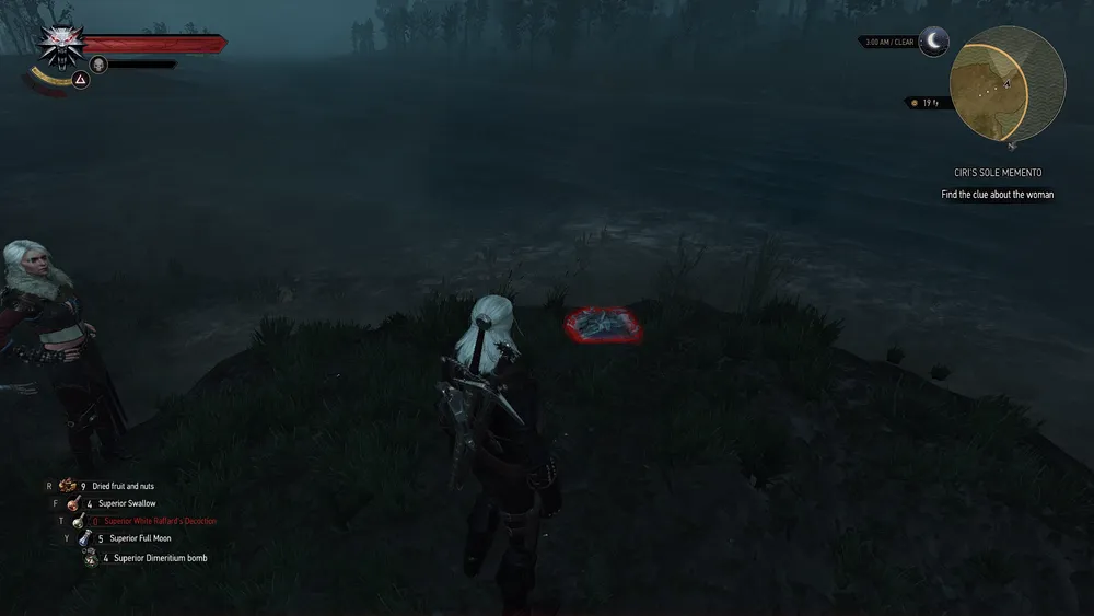 Осматриваем подсказку, Геральт делает вывод: женщина порвала платье и убежала на болото, нас учуяла ведьма. Значит, нам нужно отправляться за ведьмой, но прежде Геральт предлагает Цири отдохнуть. (Кстати, женщины в окрестностях вроде нет, я проверила. С неплохой же скоростью она удрала на болото, за 600 шагов от нас...) Находим место для отдыха и зажигаем костёр. Заодно медитируем - игра обновляет запасы эликсиров.