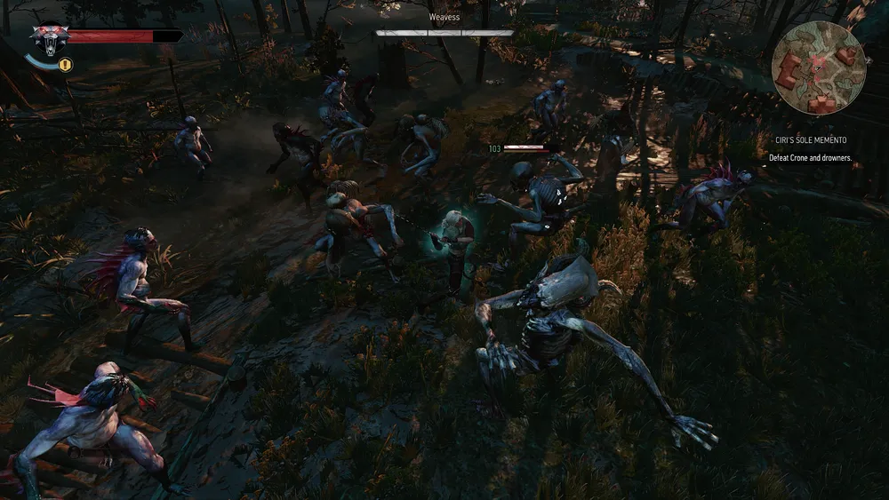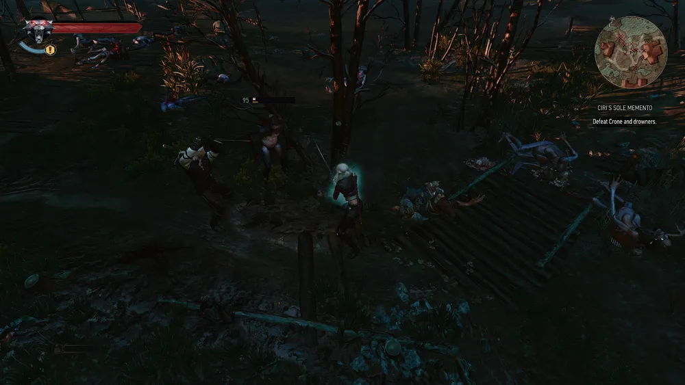 Месим в этом аду всех, до кого меч дотягивается. И помним: Цири эликсиров не пьёт, поэтому повреждения получать крайне не рекомендуется, вообще.