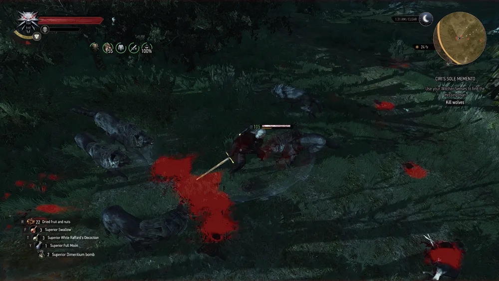 Проходим по следам мимо капканов, находим стаю волчар какого-то нетипичного окраса. Зубастые почему-то не убиваются как следует стальным мечом, - значит, принимаем решение взяться за серебро. Что-то с этими серыми не так...