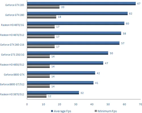 Как видим, при активации четырехкратного сглаживания и анизотропной фильтрации видеокарты AMD/ATI уступают конкурирующим решениям NVIDIA. Так, Radeon HD 4870 1G проявляет себя хуже GTX 260 Core 216, а бюджетная 8800 GT настигает Radeon HD 4850. Впрочем, снизив качество игровых эффектов, можно добиться приемлемого fps даже на HD 3870 и более скромных видеоакселераторах.